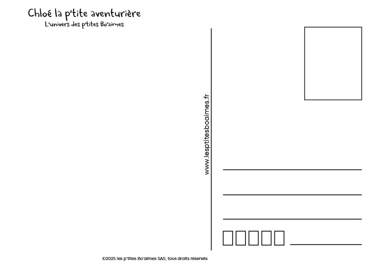 Cette carte met en scène Chloé, la p’tite aventurière devant sa maison du villages des p’tites Bo’aimes.